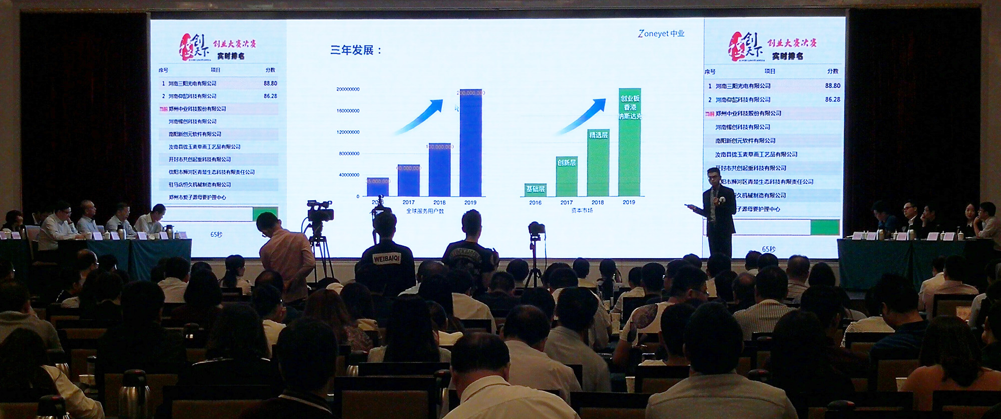 河南省《豫创天下》创业大赛的实时评分系统,用的是【纬地云】的“评分系统”系统,实现了:当场打分,当场出结果,动态排名,透明显示,“大众评委”支持支持率动态变化,点赞人数实时攀升,投资人心动意向表示,投资额当场输入,实时显示,融资意向选择当场锁定,以上内容全部在整合同一界面展示,效率高,公开、公正、透明,不给“人为插手”任何机会,彻底消除疑问和顾虑,做到比赛无争议;大众参与度高,整场跌宕起伏,扣人心弦,环节紧凑,有序可控,确保比赛在网络科技的氛围中完美收官。
